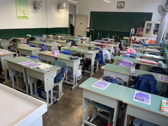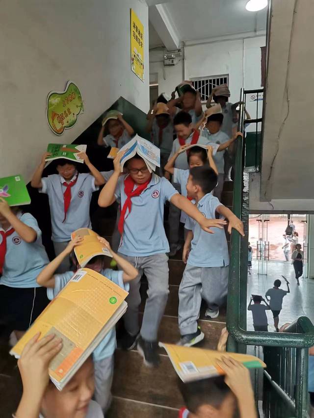 随着避震警报声响起,紧张有序的演练开始了,学生迅速抱头、躲在各自的课桌下,蜷曲身体,降低身体重心,双手护住头部。随着第二声铃声的响起后,各班立即组织本班学生用书本护住头部,弯腰低身,按照预定安全路线快速、有序地从教室撤离至升旗仪式所在位置。
