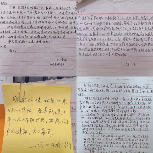 为保证离校工作顺利开展,宿管中心提前制订了详细的毕业生离校工作流程。五月份开始,各苑区就陆续开始了毕业生名单核对、毕业生寝室退电费等工作,同时密切关注毕业生的思想动态,做到提前发现问题,主动预防问题。毕业生离校期间,由于进出宿舍人员较多,中心要求工作人员加强值班和巡查,对进出人员严格登记把关,杜绝不法分子浑水摸鱼,提醒同学们提高安全防范意识,保管好贵重物品,进出关好房门。宿舍园区内,楼栋阿姨为毕业生们写下殷殷嘱托,不舍之情溢于言表。毕业生自发给宿管阿姨写感谢信、与阿姨合影,深深表达四年来的感激与不舍之情。