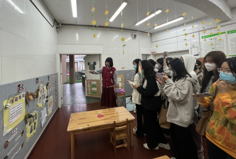 在清晨的微雨中,同学们来到幼儿园,行政老师把同学们分成3个小组,他们在幼儿园优美的晨间音乐中走进各班教室,一边认真聆听着老师们对本班环境创设、区域设置、游戏材料投放的讲解,一边仔细观察进行记录,有个别同学还情不自禁地与小朋友们互动起来,整个观摩过程是轻松自在、愉悦开心的。