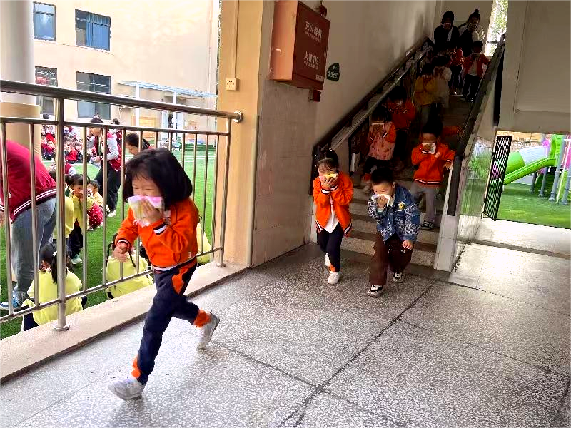 呜~~~~~~”,一阵阵急促的警报声突然响起,行政后勤老师迅速赶赴教学楼梯口,协助疏散。孩子们此时正在开展游戏活动,教师们第一时间迅速组织孩子们拿起自己的湿毛巾捂住口鼻,低姿势弯腰,按照紧急预案的疏散路线带领幼儿快速有序逃生,而演练的总时长只用了2分04秒。