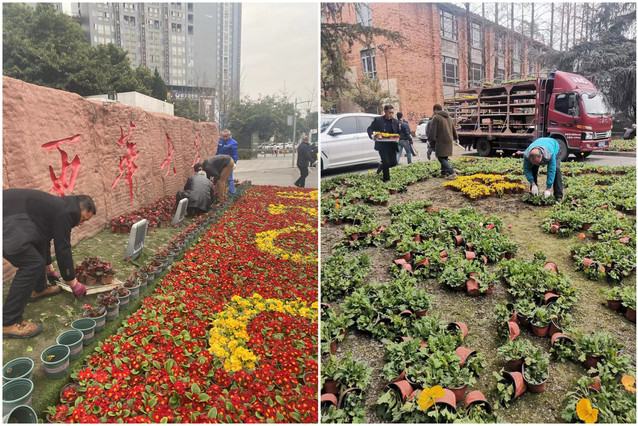 成行政楼、教学楼等周边绿地草花的栽种1300㎡,全面修剪965株行道树树池,清除枯枝残叶,确保行人安全,全新布置学校大门花坛,展示学校绚丽色彩。
