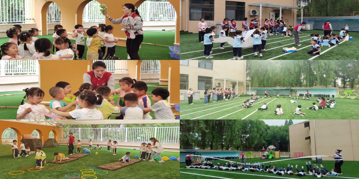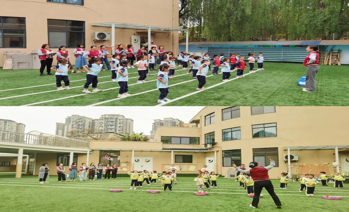 早操环节——锻炼体质,激发活力。两个班的主题都是民间游戏。清晨,孩子们在操场上兴奋不已,有欢声笑语、有叽叽喳喳、也有打闹追逐,但很快他们就被欢快的音乐、有趣的早操游戏所吸引。在老师的带领下,孩子们随着音乐的节奏舞动。他们时而跳跃,时而旋转,仿佛一幅幅生动的画面在操场上空舞动。早操不仅锻炼了孩子们的身体,还注入了良好的情绪引导,激发了他们学习活力和对艺术的热爱与关注。