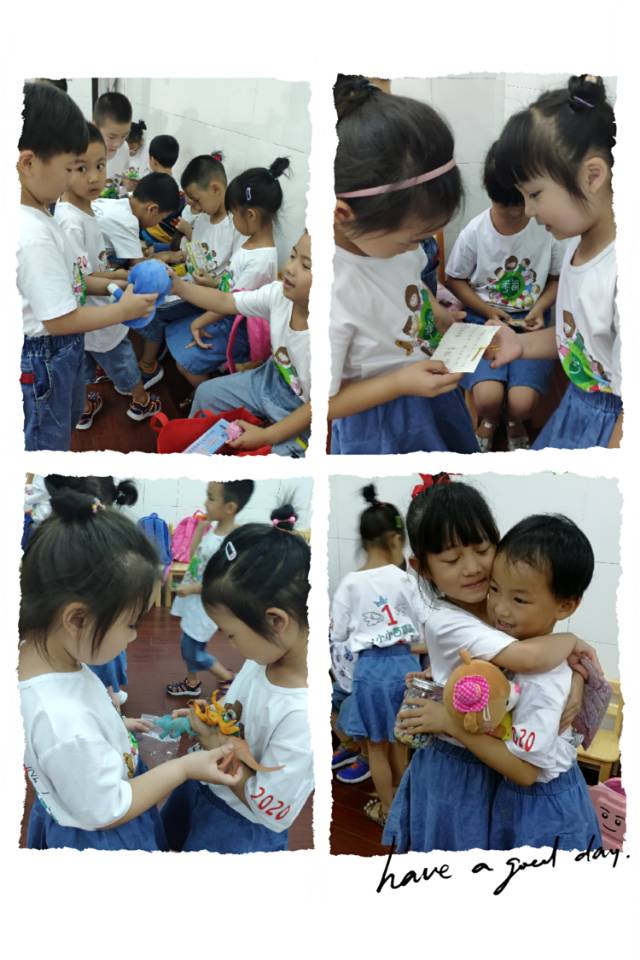 孩子们带来了礼物送给自己的好朋友,刘一墨说:“胡誉腾,送给你我最喜欢的玩偶。”罗玹吟说:“向沄汐,这是我给你写的卡片。”甘婷羽说:“黄一芯,我最爱的小恐龙送给你。”梅潇月说:“王思睿,这是我亲手折的五角星哦,你一定要好好保存。美好的祝愿都藏在小朋友们精心准备的礼物中了,要做一辈子的好朋友哦。”