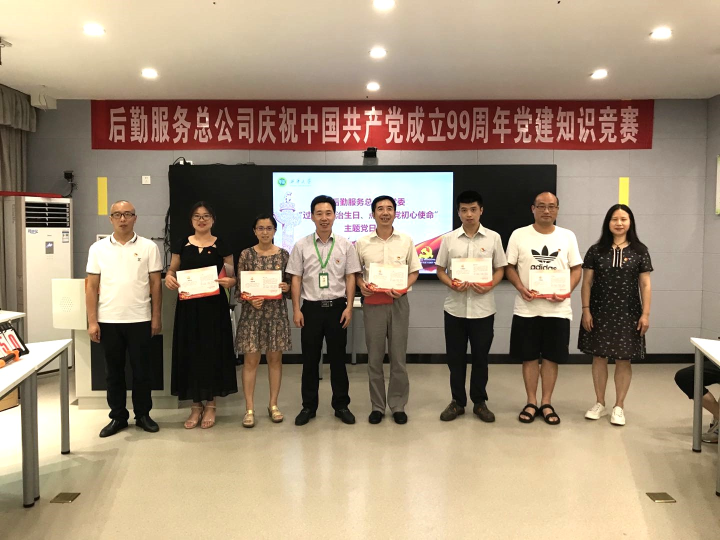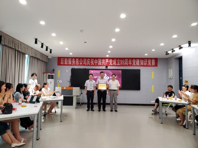 7月9日下午,后勤服务总公司在教学楼3E-105举办了庆祝建党99周年党建知识竞赛暨党员“政治生日贺卡”颁发活动。副校长刘小兵、党委组织部副部长邱刚应邀出席活动。后勤服务总公司全体领导班子成员、各党支部书记及部分党员代表共计50余人参加活动,整个活动由后勤服务总公司总经理助理王丽组织。