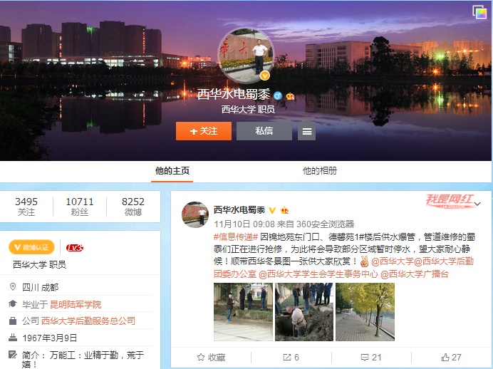 “突然停水,学生们肯定着急,我要尽快在微博上发布信息,让他们安心。”令狐昌茂是2138cn太阳城集团后勤服务总公司职员,也是学校“网红”微博号“西华水电蜀黍”的运营者。同学都亲切地称他“水电蜀黍”。