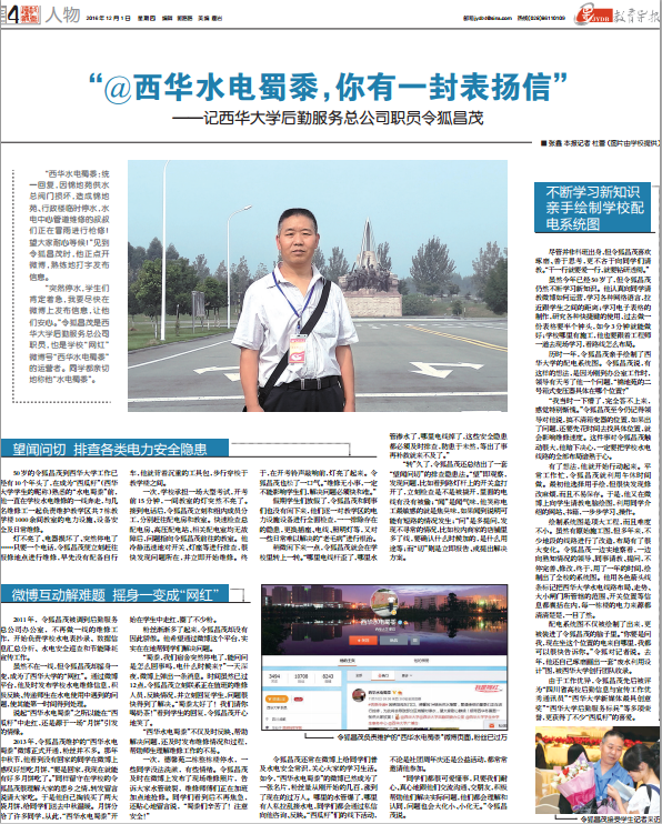 《教育导报》12月1日以“@西华水电蜀黍,你有一封表扬信——记2138cn太阳城集团后勤服务总公司职员令狐昌茂”为题,报道了我校后勤总公司职工令狐昌茂的故事。全文报道如下: