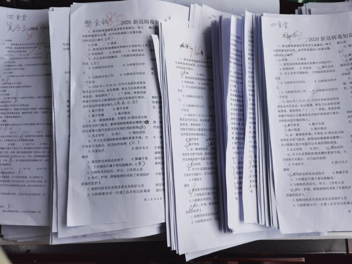 面对近期郫都区突发的新冠病例,为加深后勤职工的疫情防控意识,后勤工会五小组开展了 “新型冠状病毒知识竞答”活动。此次活动面向全体饮食服务中心从业人员,考虑到当前疫情防控形势,本次答题以考卷形式,在各食堂及部门分别进行。