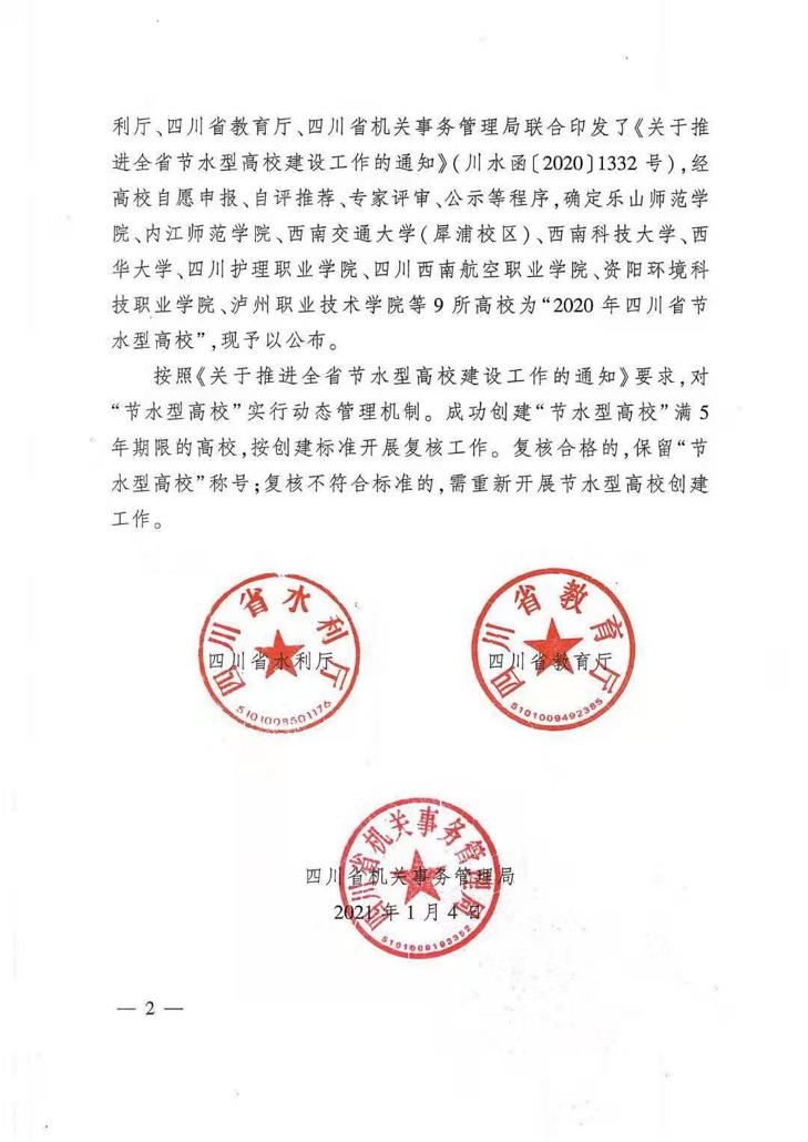 近日,四川省水利厅、教育厅、机关事务管理局联合发文,我校被授予四川省首批“节水型高校”殊荣。这是我校近年来深入践行习近平生态文明建设重要思想,大力提倡开源节流,走绿色、低碳、可持续发展办学理念成果的具体体现。