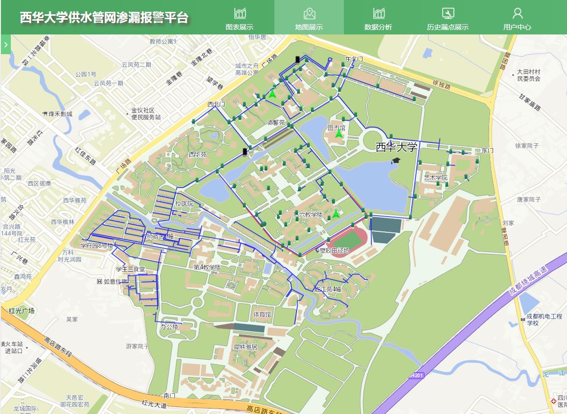 特别是针对新校区多处爆管水资源浪费严重的情况,经多方调研,于2018年、2019年建成两期地下管网渗漏监控报警平台,安装探漏仪85个,监控管网长度达6225米,覆盖新校区主要区域,平台投入使用后,能在发生渗漏初期发出预警,及时抢修,减少了水资源浪费,水量相对同期大大降低,我校是全省首家引入渗漏预警监管平台的高校,得到了上级主管领导的一致好评,并向川内其他高校推广。