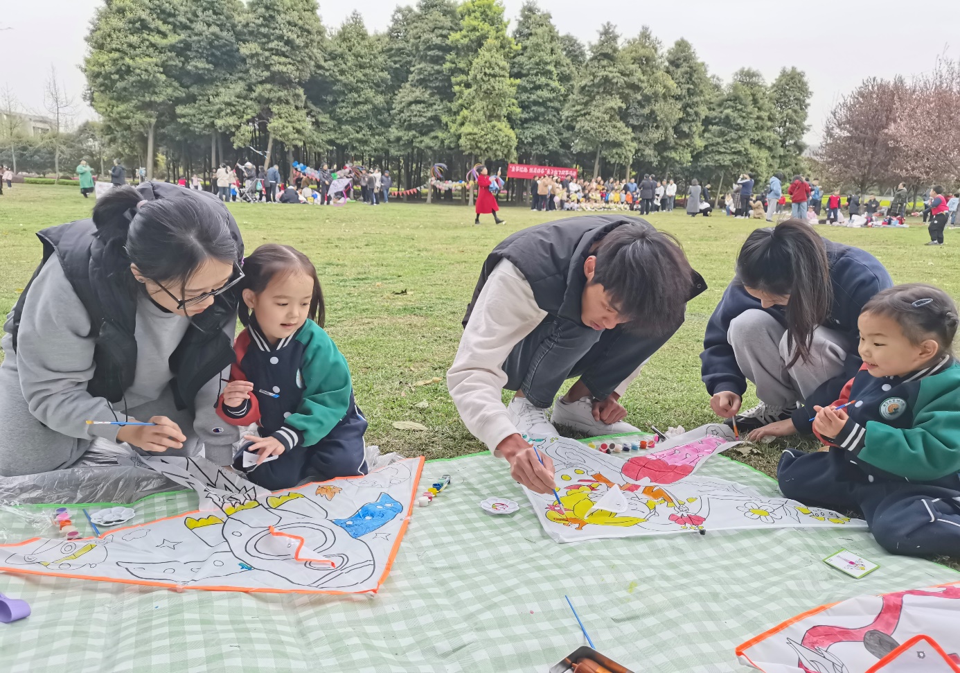 活动当天,孩子和爸爸妈妈们早早来到提前划分好的班级区域,在老师的组织下拿出颜料和画笔开始绘制风筝。家长们兴致盎然,与孩子合作涂鸦、创作。家长与孩子一起互动,把对春天的喜爱和彼此的温馨有爱都画进了风筝里,一只只风筝在小手中“活”了起来。家长和孩子们拿着自己的作品一起迎着春风奔跑,手中的线越放越长,它们在空中相互追逐、嬉戏,与蓝天白云构成了一幅美丽的春日画卷。活动现场,老师们还组织开展了拔河比赛和亲子活动,不仅锻炼了孩子们的体魄,更增进了对团队合作精神的理解。
