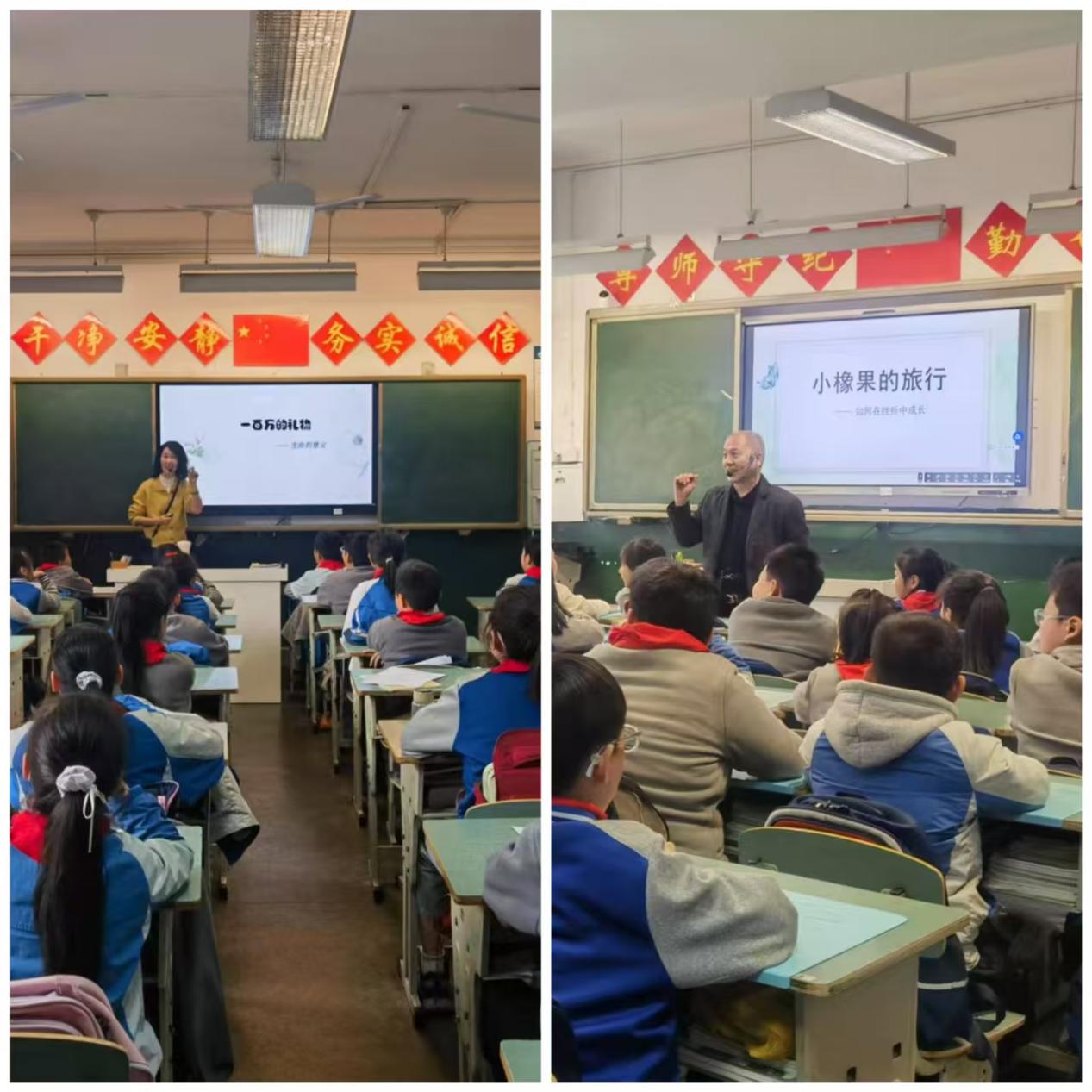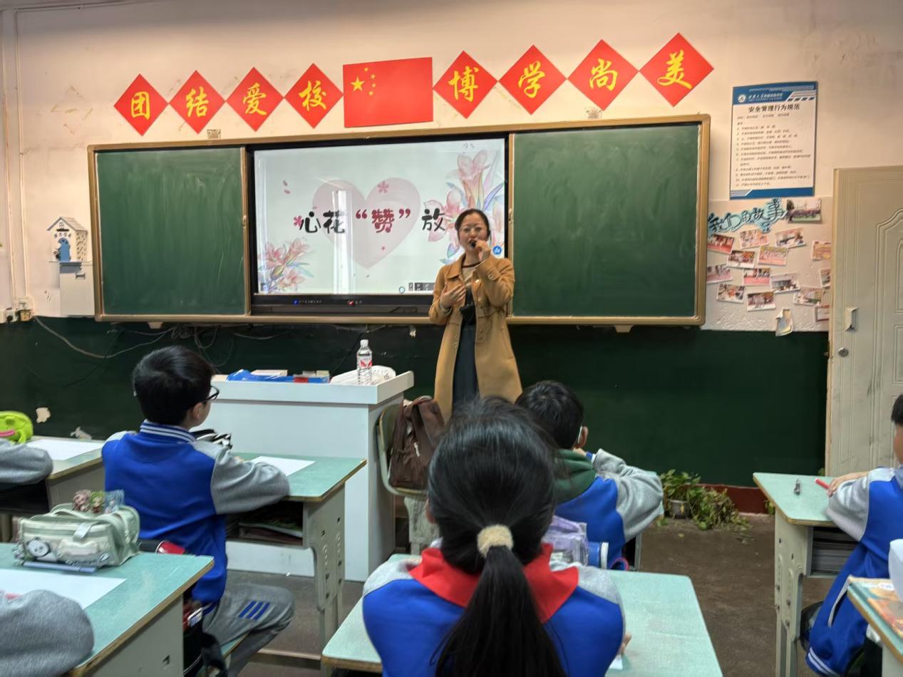不同学龄的孩子有不同的心理发展特点。三位老师认真准备、倾心投入,为3-6年级孩子们带来了各具特色的沉浸式引导和教育。杨美玲老师引导三年级的学生放松身心,学会用绘画释放内心,以心情绘画之旅梳理自己的情绪和行为。张力新老师则为四年级孩子带来了一场关于梦想与挫折的现场展示:通过让孩子们观察树木年轮、为橡果设计盔甲,引导他们绘制自己的人生图谱、铸造自己的心理韧性,让心理健康教育从后期的矫正问题前移至分享、感受和滋养生命。张沙老师通过生动的角色扮演和情景动画,带领五年级孩子们走进绘本世界。以互动提问的方式引导孩子们思考如何面对离别、怎样珍惜情感联结,让学生懂得生命的价值不在于相处的长久或多少,而在于用心建立和保持真实的情感联结。杨美玲老师引导六年级学生在自身经历和事例分析中学习如何有效地表达赞美,并在现场让孩子们积极参与,在热烈的氛围中感受赞美的力量。