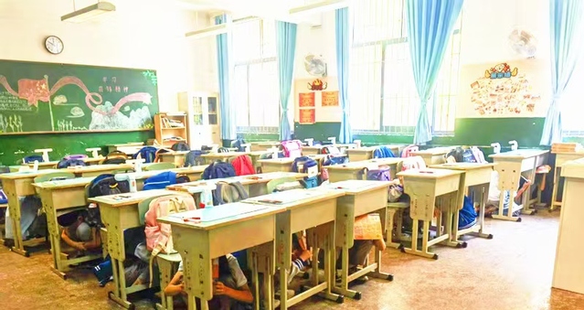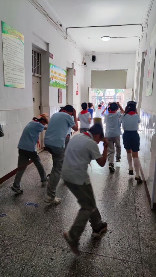 上午10时,随着警报声骤然响起,演练正式拉开帷幕。正在上课的470余名师生迅速进入应急状态,各区域负责人立即到位,各班教师立即组织学生采取“伏地、遮挡、手抓牢”的规范避震动作,就近躲避在课桌下方或承重墙角落。1分钟后,疏散指令发出,全体师生按照预定逃生路线,弯腰护头、有序撤离教学楼,并在操场指定区域完成集结。班主任立即检查人数,各班班长到旗台处报告。整个疏散过程,无拥挤、踩踏情况发生,展现出师生们良好的应急素质。