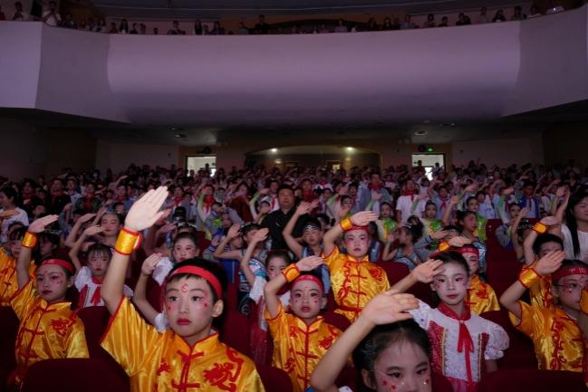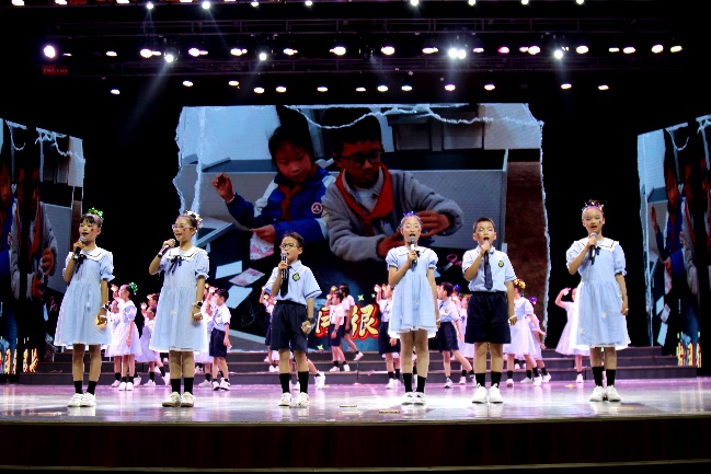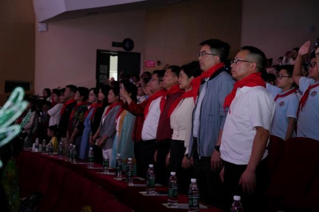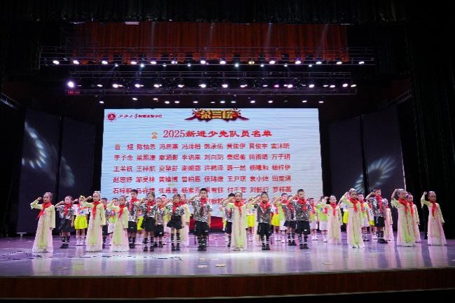 入队仪式结束后,精彩纷呈的文艺汇演正式拉开帷幕。篮球啦啦操《哪吒》融合了街舞的炫酷与武术的刚劲,率先点燃全场热情。一首《光亮》,唱响了青春的光芒与梦想的力量。舞蹈《小书包》以童真童趣展现了孩子们的自信与对未来的向往。舞台剧《玉盘》表达了一场跨越千年的星辰之约,展现了古蜀文明和现代科技对人类发展的美好期盼。