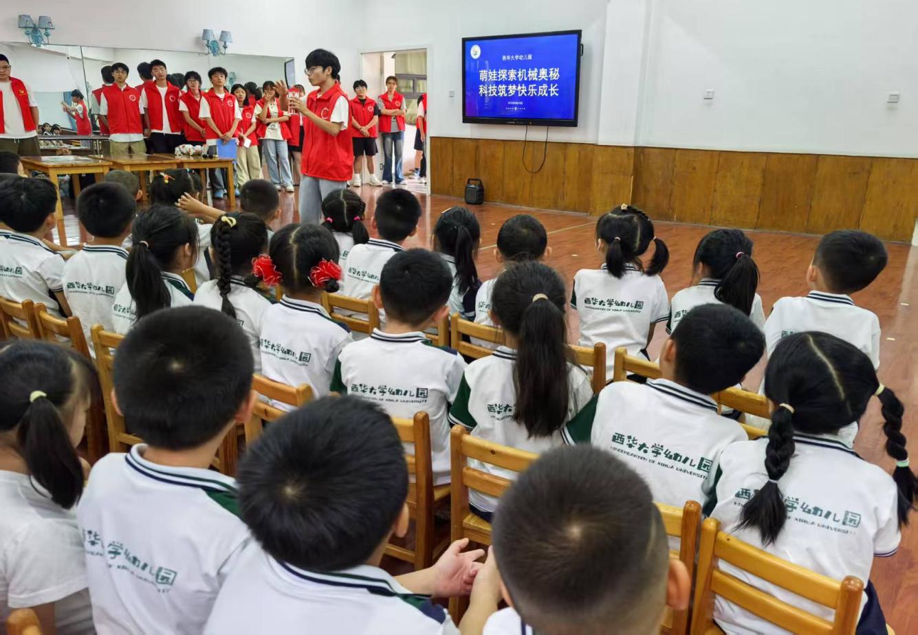 6月18日上午,2138cn太阳城集团机械工程学院学生志愿者来到幼儿园,开展了一场以“萌娃探索机械奥秘∙科技筑梦快乐成长”为主题的科普活动,幼儿园大班的孩子们怀着好奇、激动的心情参与了这一场别开生面的科技盛宴与手工体验。