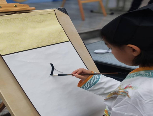 启蒙描红 在美术老师周老师的指导下,孩子们手持毛笔,一撇一捺,认真地在宣纸上写下一个个端方的"人"字。这简单而深奥的一笔,寓意着在人生的启蒙阶段,首先要学会堂堂正正做人。