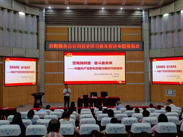 为扎实开展公司党史学习教育各项工作,持续推进党史学习教育入脑入心、走深走实。6月21日,后勤服务总公司在四教报告厅召开党史学习教育宣讲专题报告会,邀请学校宣讲团成员、马克思主义学院副院长郑小明教授为公司全体党员、干部、入党积极分子作题为《苦难铸辉煌奋斗赢未来——中国共产党百年历程与新时代的使命》的专题报告,报告会由党委书记赵东主持。