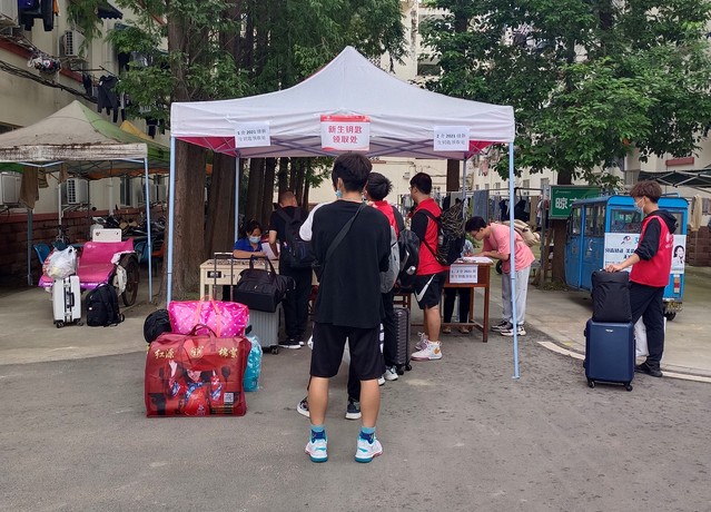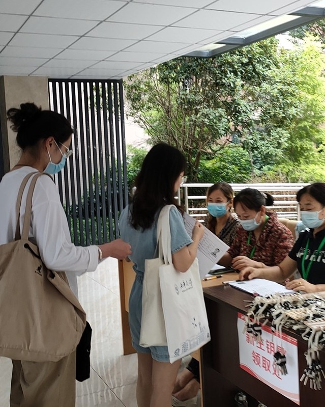 为了更好地服务2021级新生,中心在德馨苑、锦地苑、临江苑、老区四个苑区共设置9个迎新点,并在各个苑区内张贴了路标、入住流程、防盗宣传标语等,方便新生及时找到自己的宿舍。迎新工作当天,中心员工以饱满的热情欢迎新同学的到来,为新生办理入住手续期间,工作人员认真细致地回答新生咨询的每一个问题,耐心引导,悉心为同学分发宿舍钥匙,新生同学们也积极配合,宿舍迎新秩序井然。同时宿舍管理员还对进入宿舍楼的每一名人员进行身份确认,不间断的对宿舍楼内与楼外进行巡查,确保新生的财物、人身安全,并对违规散发宣传物者,进行了及时制止和驱离,较好地维护了迎新现场的工作秩序。中心维修工人随时待岗,一接到报修,第一时间到达现场,解决问题。中心保洁员工在各自岗位上及时清理产生的垃圾,确保楼内干净整洁,并热情主动地帮助新生解疑带路、搬运行李,各苑区工作人员的热情服务让新生真切感受到了家的温暖。