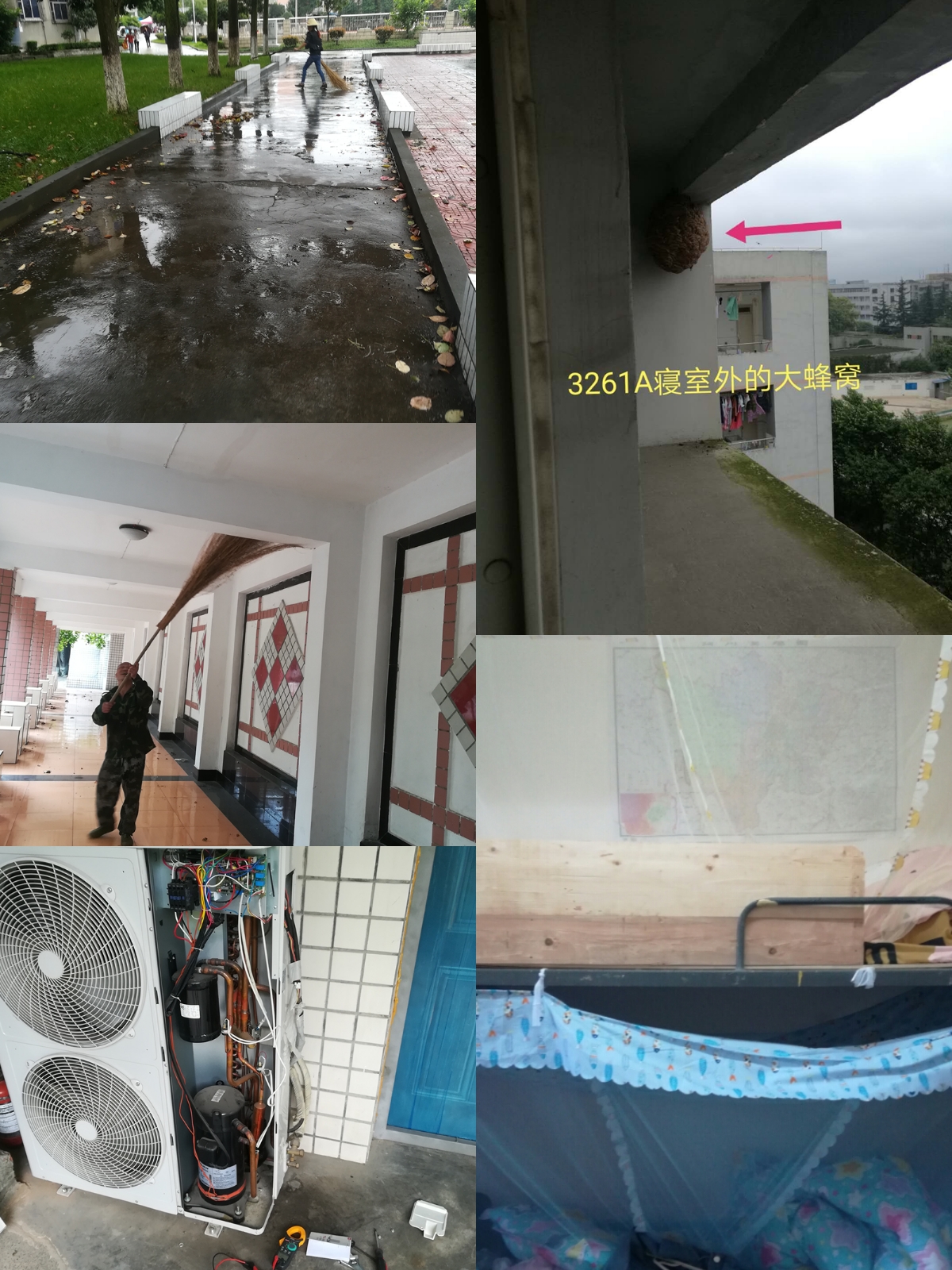 绿化环卫利用国庆期间对校园的垂枝掉枝进行了处理,大假的最后一天协助消防人员对学生公寓窗外的蜂包进行了彻底处理确保学生的生命安全。物业工作人员协助维修人员对六教音乐厅空调进行了维修,并协助五教安放多媒体教室完成最后的收尾工作,确保了节后教学正常的进行。