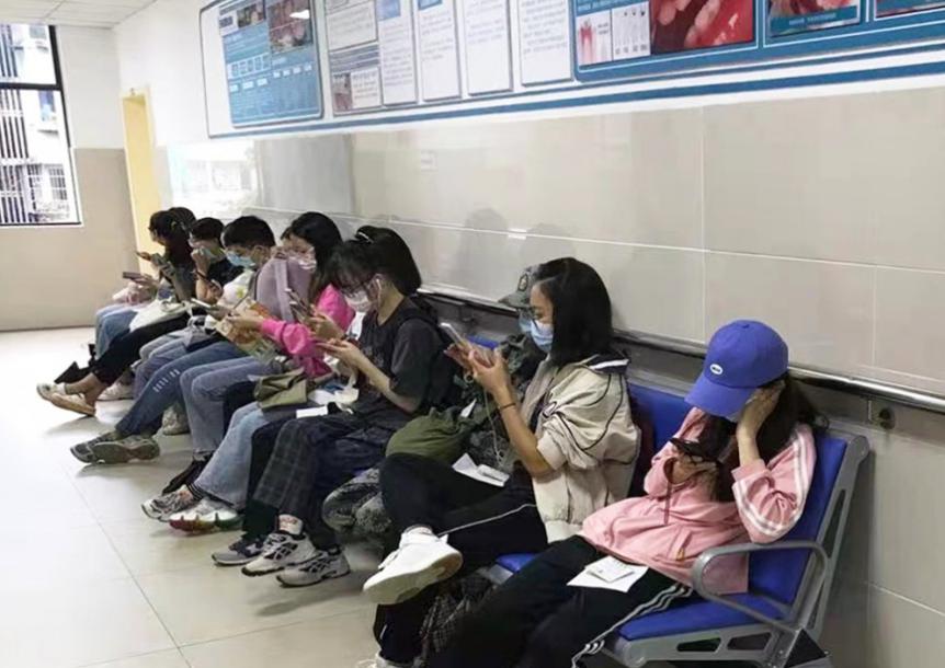 诊室外排队等候的义诊的患者