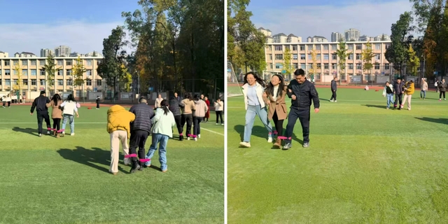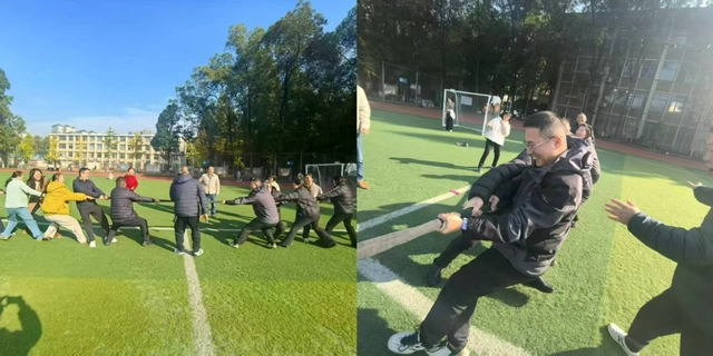 随后,活动场地转移至锦地苑足球场,拔河比赛、3 人 2 足两项团队协作项目相继开展。拔河比赛以部门为单位,学生公寓中心、物业管理中心、采供管理中心组成参赛队伍,队员们心往一处想、劲往一处使,紧握长绳奋力拼搏,场外加油声、呐喊声不绝于耳,最终以中线过 “河界” 为标准,经三局两胜决出名次;3 人 2 足比赛,各部门 派出的3 名队员相互配合、步调一致,在欢声笑语中跨越终点线,用时最短者胜出。两项运动既考验了团队的协作默契,更培养了大家的拼搏精神,让会员们在竞技中增进交流,在协作中凝聚情谊。