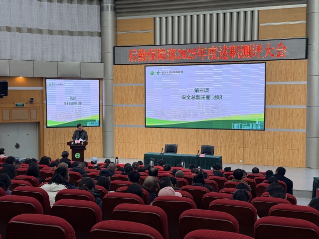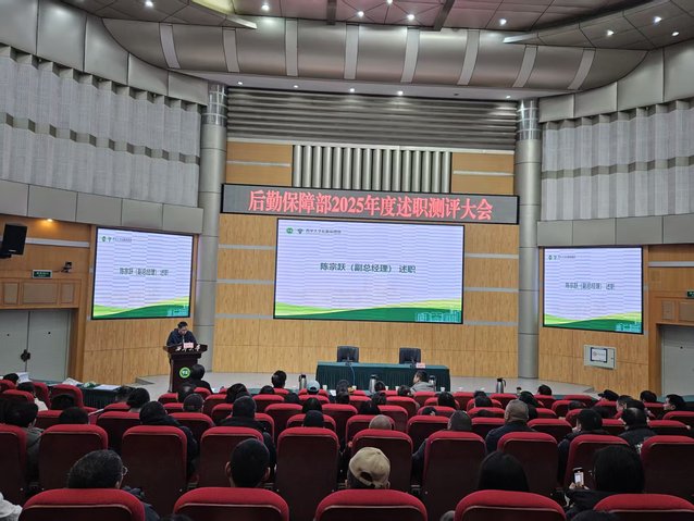 2025年12月30日,后勤保障部在四教报告厅召开2025年度述职测评大会。后保部领导班子、各中心负责人、各中心教职工代表参加会议。述职测评大会由后保部党政办主任谭佳主持。