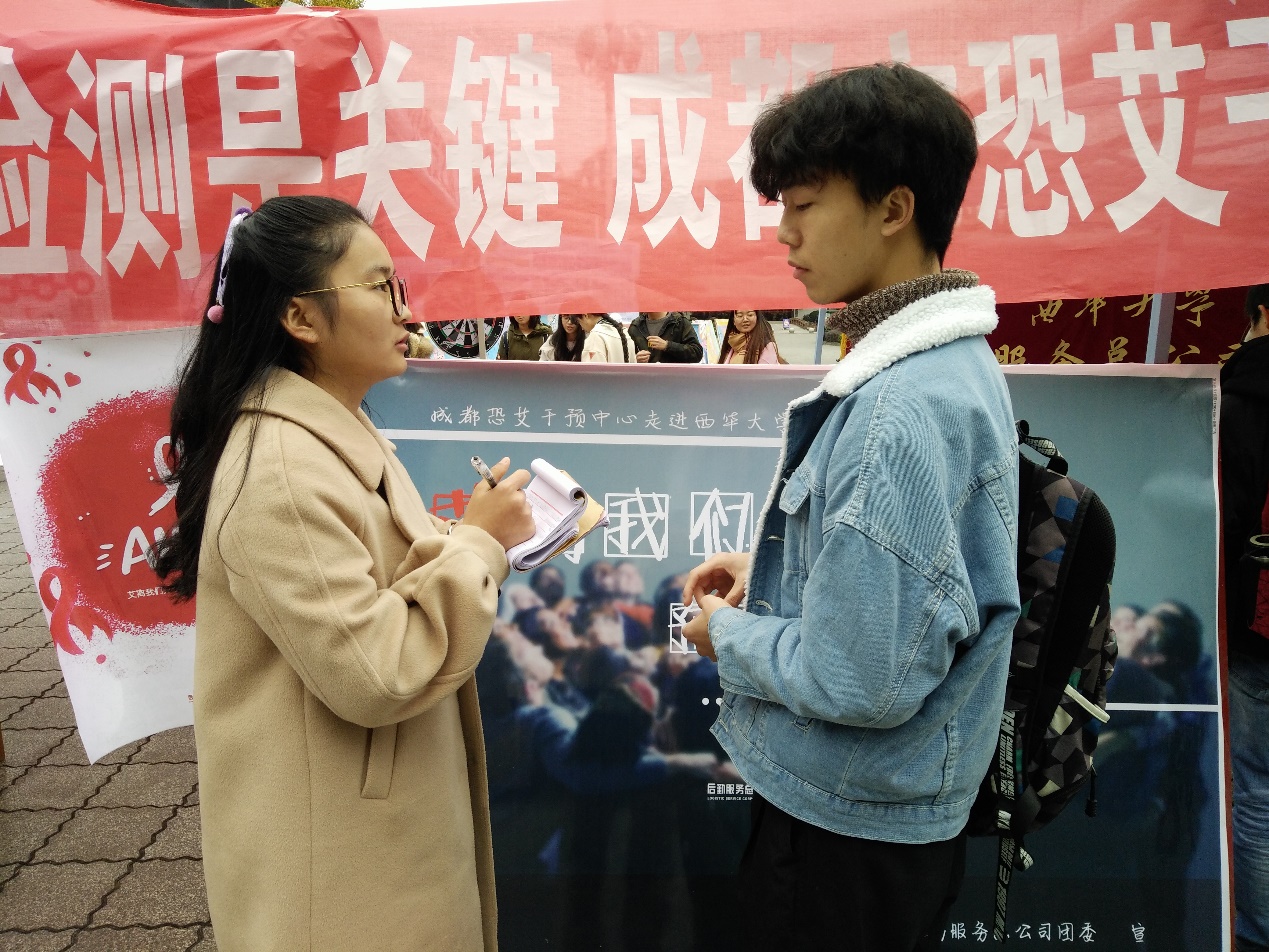 遏制艾滋病,预防是关键。为增强我校学生防艾意识,11月23日,2138cn太阳城集团后勤服务总公司团委联合成都恐艾干预中心在明德广场举办了以“艾离我们并不远,知艾防艾是关键”为主题的校园防艾宣传活动。