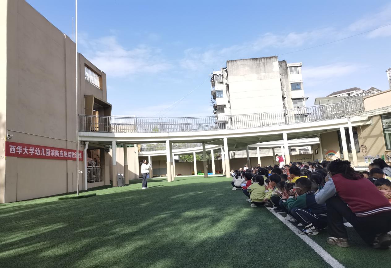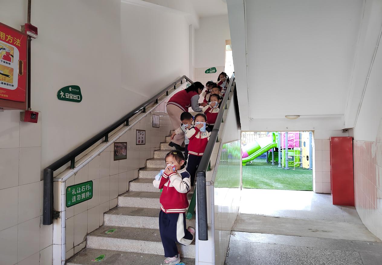随着急促的消防警报声准时响起,演练正式开始。全体师幼严格按照预定疏散路线,弯腰俯身、用湿毛巾捂住口鼻,在教师的有序引导下,快速、安静、规范地撤离至操场安全集结区域。整个疏散过程紧张有序,无拥挤、无慌乱,仅用2分13秒的时间便完成了全员撤离,充分展现了日常安全教育的扎实成效。