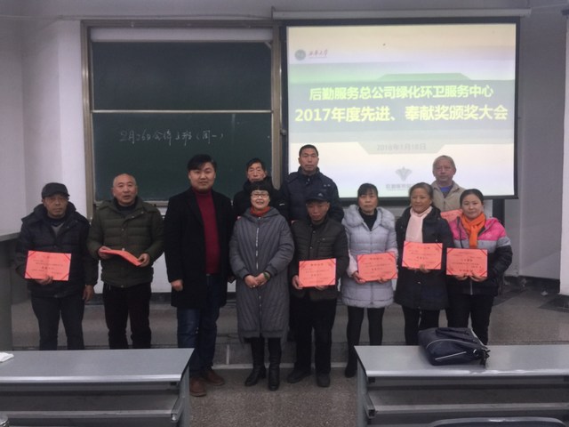 大会首先对2017年度绿化环卫服务中心评选出的14位先进个人及工作满10年、20年的后勤员工进行了表彰。曾莉蓉主任宣读了2017年度绿化环卫服务中心先进个人及工作满10年、20年获得奉献奖的员工名单,参会的领导在参会人员的热烈掌声中为获奖人员及代表们颁发荣誉证书并合照留念。