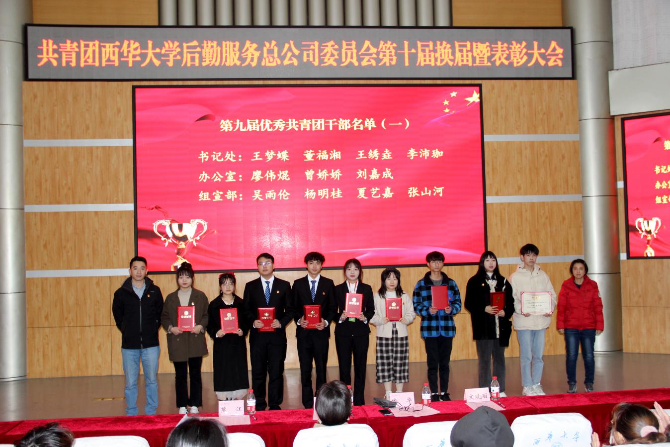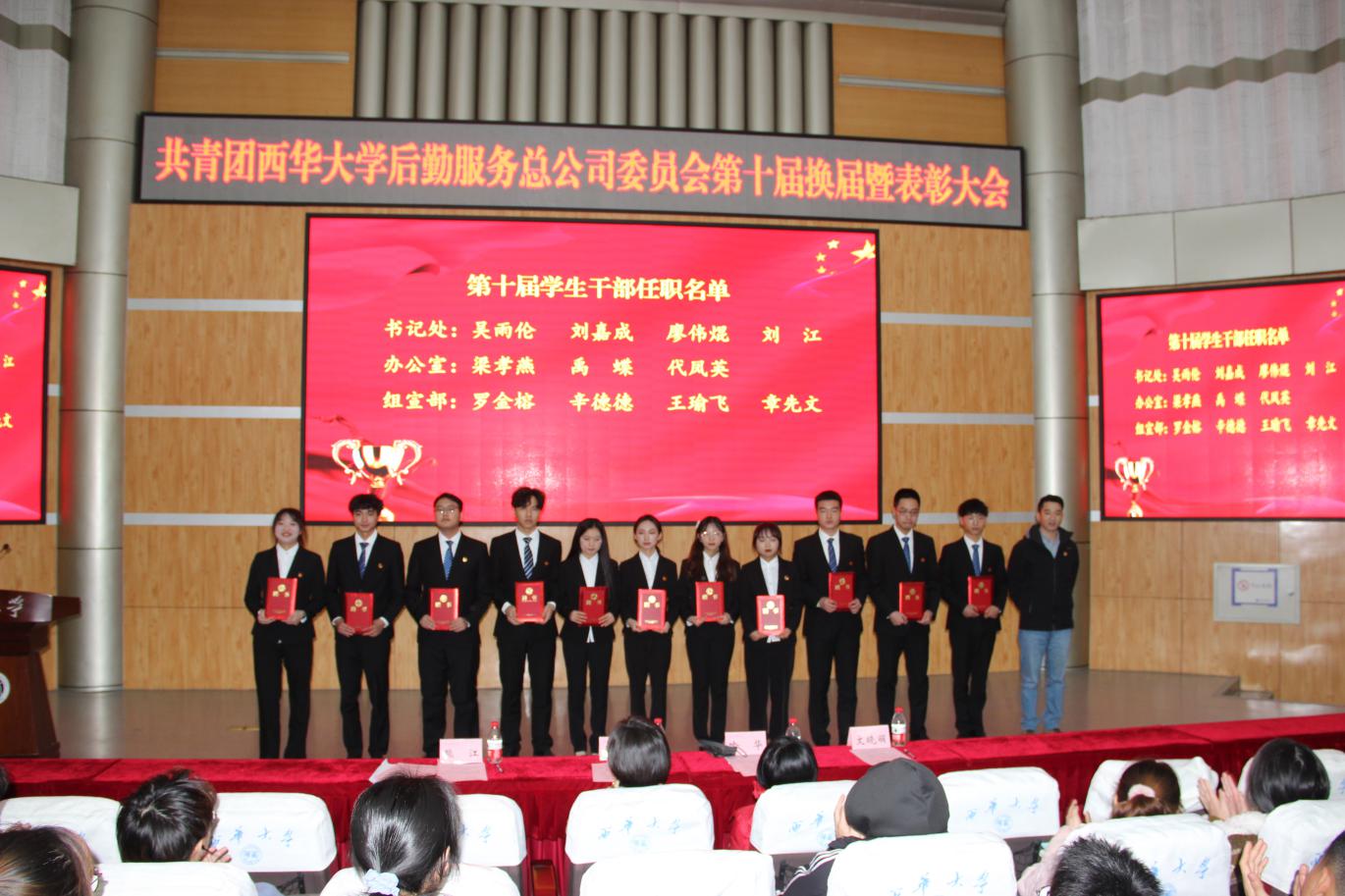 12月16日,后勤服务总公司团委第十届学生干部换届暨表彰大会在四教报告厅顺利举行。后勤服务总公司办公室主任谭佳、副主任喻华,分团委书记熊江,各学院团委代表,分团委全体学生干部干事等200余人参加大会。