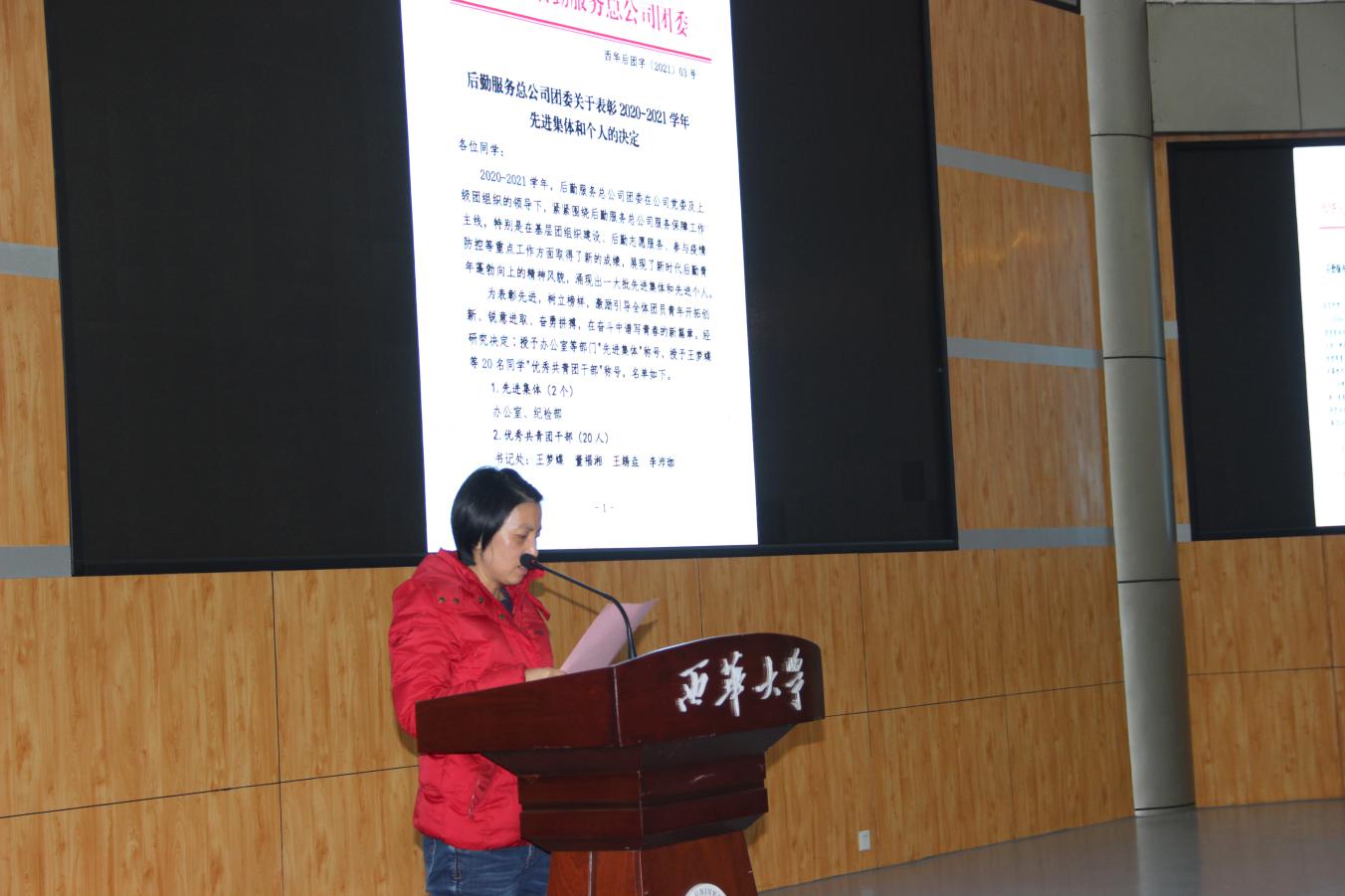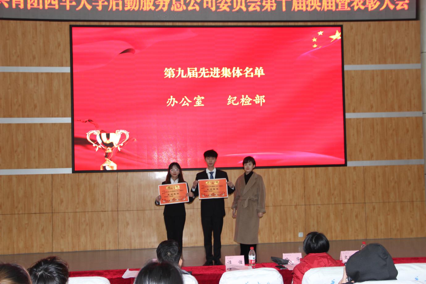 会上,办公室副主任喻华宣读《后勤服务总公司团委关于表彰2020-2021学年先进集体和个人的决定》文件,她对受表彰的集体和个人真挚寄语,希望同学们珍惜荣誉,再接再厉,戒骄戒躁,在今后的学习和工作中继续发挥模范带头作用;分团委书记熊江宣读《后勤服务总公司团委关于任命第十届学生干部的决定》;会上还依次为先进集体和个人颁发了获奖证书及聘书。