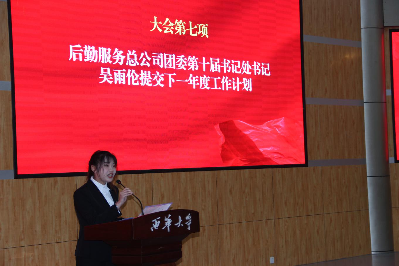 第十届书记处书记吴雨伦同学提交下一年度工作计划,她分别从如何做好基层团组织的建设工作、如何发挥好在学生与后勤服务间的桥梁纽带作用、如何当好公司党委的助手等三个方面进行了汇报,她表示将会切实做好公司交办的各项工作,努力营造积极向上的工作氛围,强化干部干事的专业水平和服务能力;干事代表周垚同学也在会上进行发言分享。