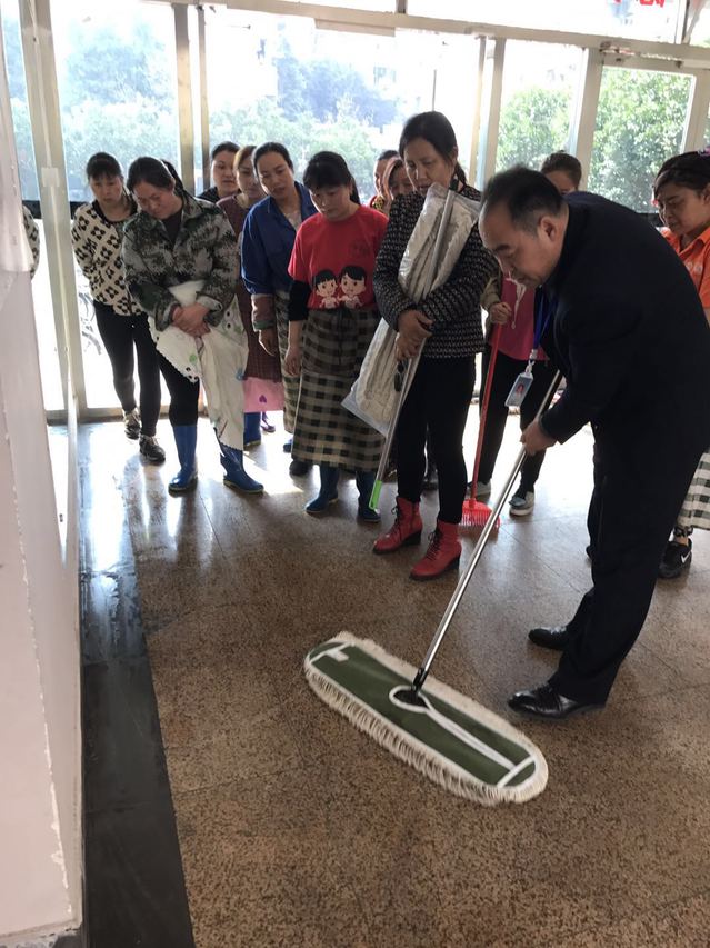 此次培训由中心主任梁开均主持,培训对象为宿舍管理员和保洁员。培训开始,梁主任首先讲解了保洁作业的相关操作程序和原则,过后对试剂配比、保洁工具、检查标准等使用方法进行了详细阐述,对员工所反映的保洁难点问题进行了现场探讨与指导。梁主任强调,宿舍卫生不仅要总体感官效果好,更要用心投入去做,尤其是清理卫生死角,追求“白璧无瑕”,精益求精,杜绝丝毫懈怠。