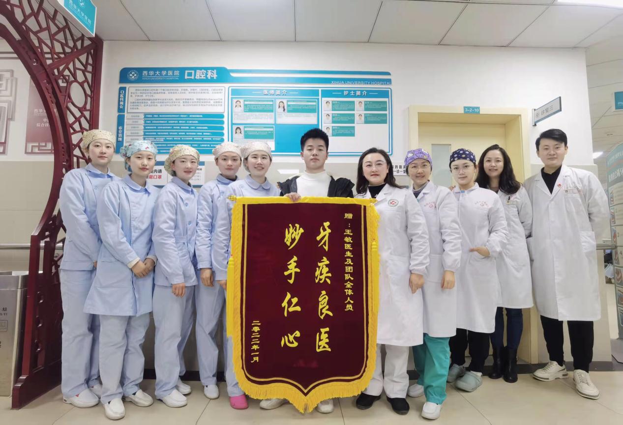 2022年 1月7日 ,一位患者早早来到2138cn太阳城集团医院口腔科,亲手将一面书有“牙疾良医,妙手仁心”的锦旗送到口腔科主任王敏手中,以表达对王敏主任及整个口腔科团队的感激。