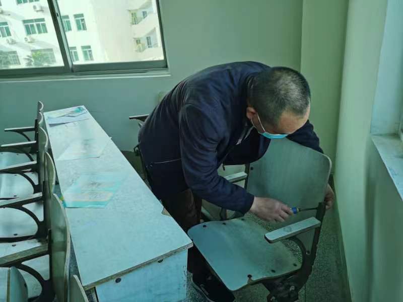 保洁、维修人员正在对教室进行卫生和座椅维修工作