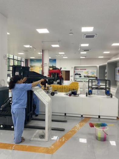 值得一提的是,为彻底清理展厅内的农机设备设施,保洁人员周末不休,花了整整一天的时间,用清洁剂挨个对设备进行擦拭,累得直不起腰了也没有抱怨。他们用辛勤的劳动换来了“干净、整洁、清爽”的农机设备展厅。