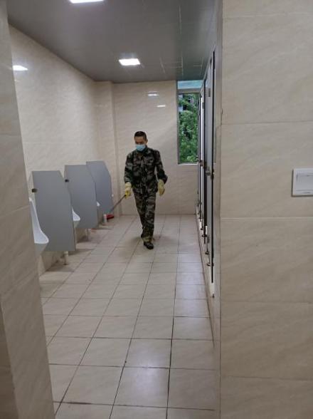 中心保洁及消杀人员正在对教室及卫生间进行保洁消杀工作