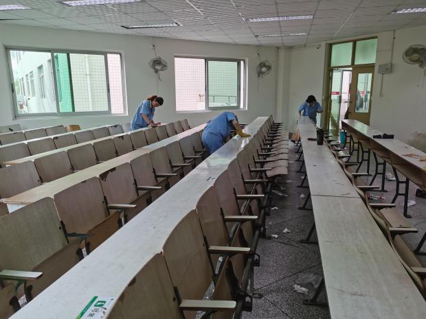 此次英语四六级考试涉及物业中心管辖区域的考场分别设在第三教学楼及第四教学楼,其中有自习室、专用教室等,自习室6间的桌椅需要清理出教室,专用教室11间需要重新布置桌椅,工作量较大。为做好考试期间的疫情防控及后勤物业保障工作,中心高度重视,提前召开专项工作会议,精心组织、周密安排,对考场内桌椅板凳、照明灯、风扇等进行多次排查,确保各项设施设备正常使用;以标准化要求组织保洁人员彻底打扫考场卫生,清理书籍杂物,对桌椅缝隙全方位无死角保洁,确保桌面光滑、无涂写污迹、考场无纸屑。在做好考场及公共区域卫生消毒的同时,加强秩序维护及安全巡查工作。考试当日,保洁人员全天值班,做好考点的各项服务保障工作。