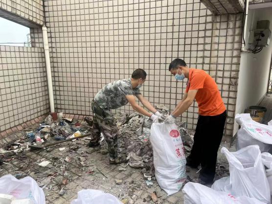秩序维护队员正在清理楼顶建渣、杂草
