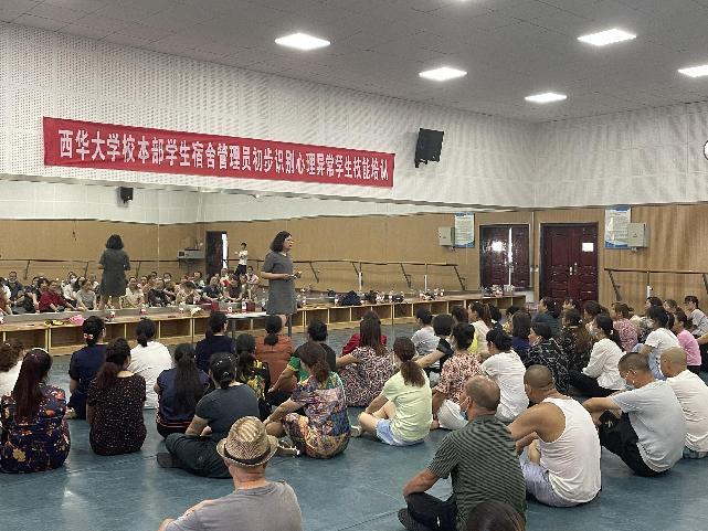 为深入贯彻高校工作“三全育人”的工作要求,积极落实以学生为中心,为师生服好务的工作宗旨,切实提高宿管中心员工的工作水平。7月7日上午,学校心理健康教育中心组织刘英华老师、杨科老师为学生宿舍管理人员开展了一次学生宿舍管理员初步识别心理异常学生的技能培训,心理健康教育中心主任王强主持培训活动。