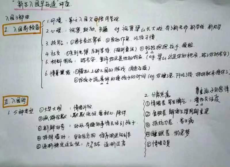 冷老师首先从新生入园孩子表现的不同类型进行了精彩的讲解,接着针对家园应对的策略、以及如何做好家园共育,支持孩子渡过入园适应期这两个方面,给家长们提出了科学、合理的建议。大家仔细聆听,认真做笔记、写下心得体会。