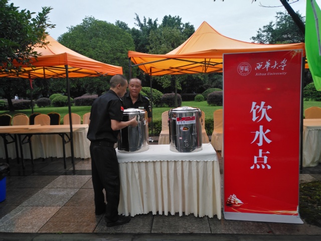 西华物业中心接到这次迎新送开水工作后,中心立即组织两名秩序队员从早上6点过开始送开水工作。早上7点物业中心秩序队员已经将6桶开水准时送达迎新饮水点。今年迎新物业中心摆设了两个饮水点,分别在行政楼对面家长休息区、三教外新生报到区。两个饮水区各放置两桶开水。物业中心队员在现场随时关注开水饮用情况,及时添加,保证开水桶有水。今天早上第一次送开水6桶,临近中午的时候两名秩序队员又到开水房添加了两桶,截止发稿中心已经完成送开水10余桶。