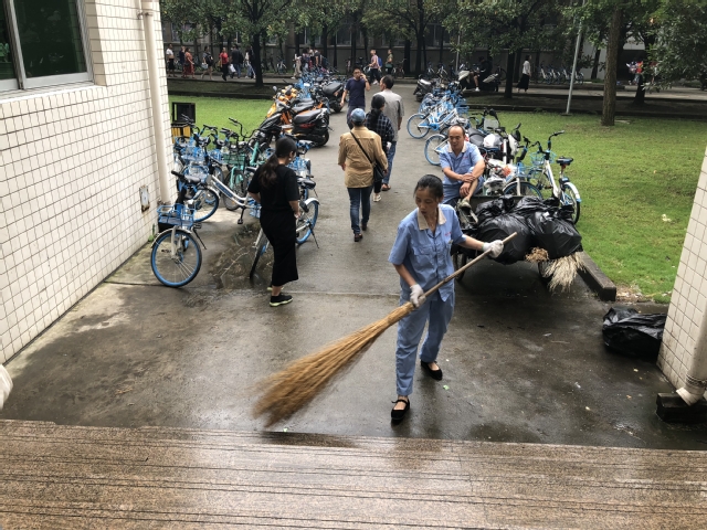 那边秩序队员忙着送开水,这边物业中心保洁员也在展开紧张忙碌的保洁工作。9月6日、7日为期两天迎新工作,三教外围坝子、教室来往人群达到饱和。其中涉及到厕所、教室、过道频频使用,保洁员的工作量比平日大了许多。中心要求迎新专区保洁员中午不能回家休息,晚上7点才能下班,确保迎新区域环境卫生整洁。