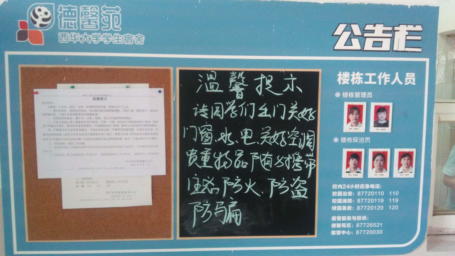 迎新当天,在宿舍园区内到处可以看到宿管工作人员忙碌的身影,她们不辞辛苦、尽职尽责,尽最大努力为新生们提供方便和人性化的服务,让刚刚踏入大学校园的新生和家长们感受到了家一般的温暖。同时宿舍管理员在宿舍楼内监督巡视,为严防各类推销人员,用温馨提示的形式提醒学生们注意各项安全。维修师傅更是随时待命,一有问题,他们会第一时间赶到维修现场,全力保证新生满意入住。