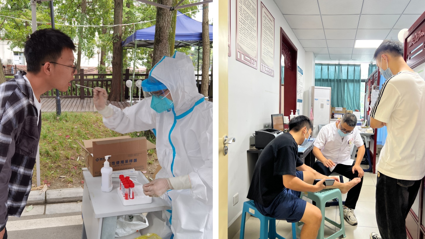 中医科龚乾龙医生为师生核酸采样 骨伤科胡绍波医生为同学治疗腿伤