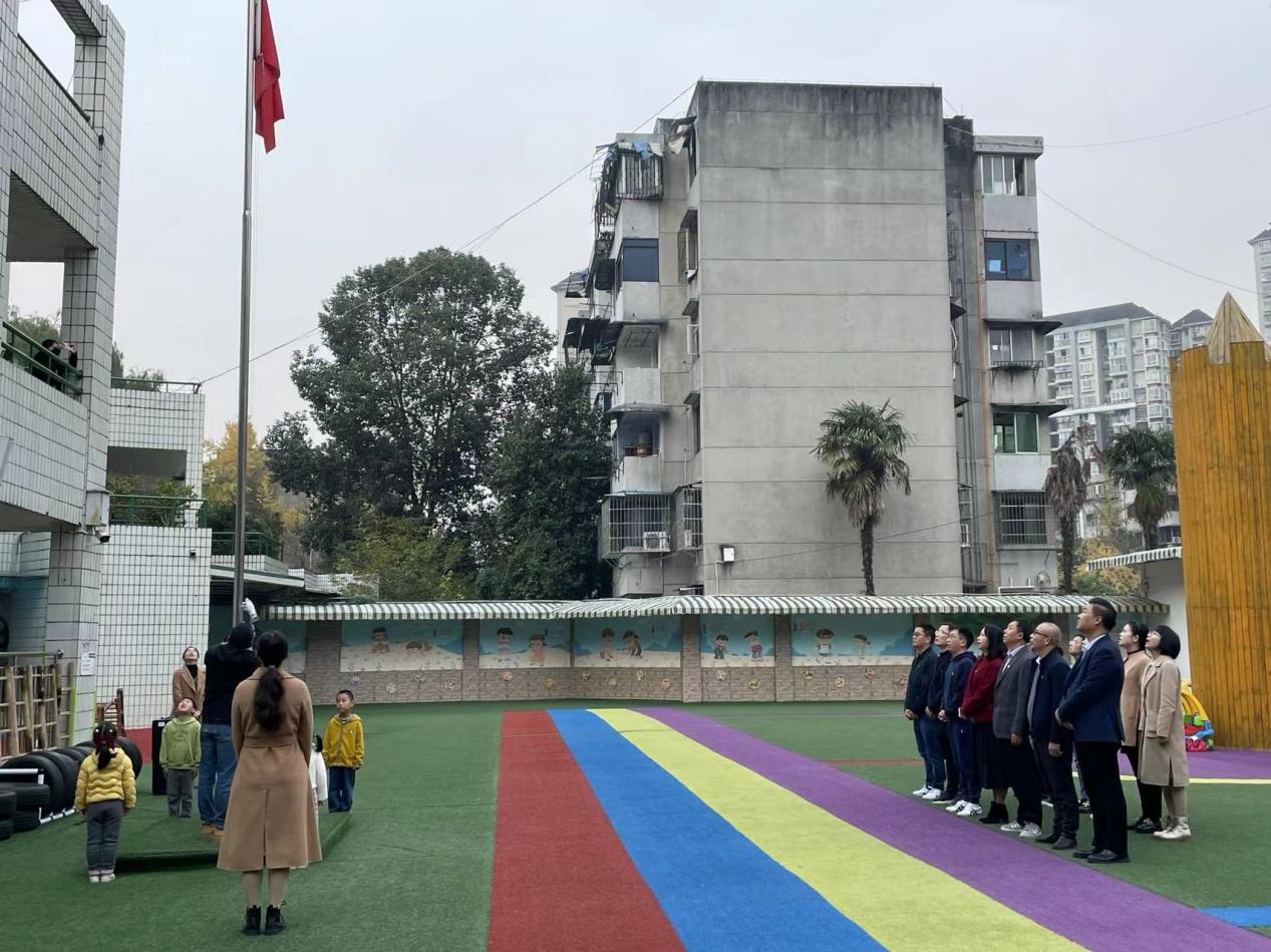 第二阶段,举行了升旗仪式。伴随着激昂雄壮的《义勇军进行曲》,在幼儿园小朋友参与下,护旗队员迈着整齐步伐护卫国旗入场,全场人员齐唱国歌,面向国旗行注目礼。鲜红的五星红旗像一团炽热的火焰迎着朝阳,沐浴晨曦冉冉升起。现场庄严肃穆,每个人心中都充满了对党的无限热爱。