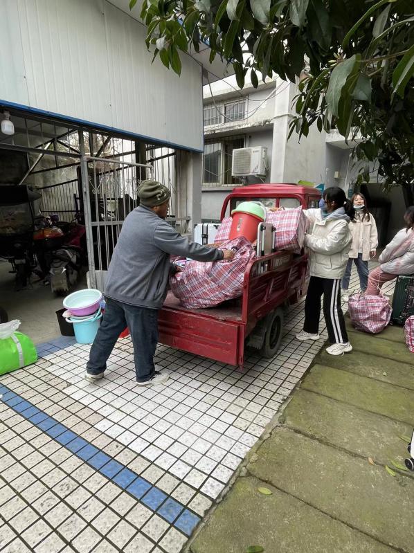 搬迁当天中午,为了给同学们提供最大程度的便利,彭州校区后勤十名职工组成临时小分队,骑上自己的三轮车往返于新老校区之间,为学生搬运行李。截止晚上21:00,共搬迁大一、大三学生200多人,搬运大小行李近2000件。