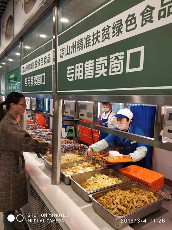 同时,为了做好精准扶贫工作,推进定点帮扶布拖县特色产品——黄心土豆系列产品的开发和推广,饮食中心下属各个食堂设立的精准扶贫窗口新推出了土豆、莲白系列:土豆丝、土豆条、土豆片、孜然土豆、麻辣土豆、烧烤土豆、狼牙土豆、莲白回锅、手撕莲白、醋溜莲白、莲白炒蛋……清炒、炝炒、煎、炸、炖、煮,各式做法让人琳琅满目,百吃不厌,让师生们品尝到了来自大凉山的纯天然美食。