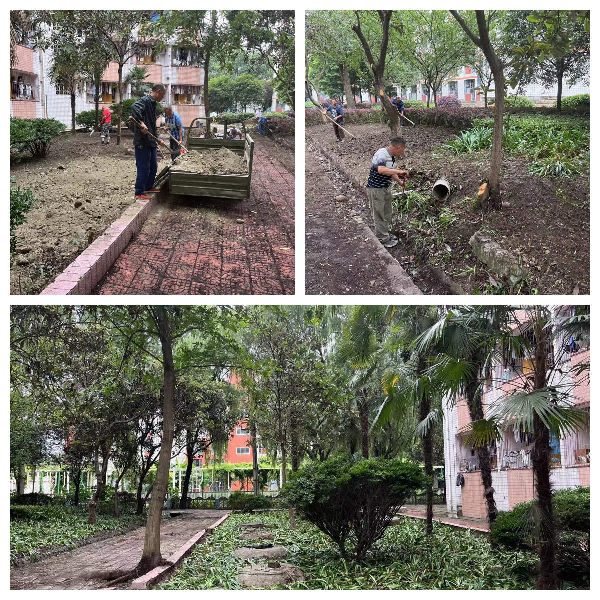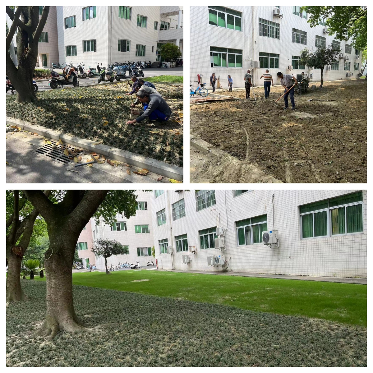 针对学校部分绿地的绿化斑秃问题,中心对行政楼至体育馆周边的绿地进行全面整改,从土壤的翻耕、施肥、精细平整到撒播草种或栽植麦冬,工人们不顾炎炎夏日、忙碌劳作,绝不放过任何一处裸露的黄土,在草坪建植完成后,随即又投入到绿化灌溉、杂草清理等养护管理工作中去,精细呵护植物健康成长。