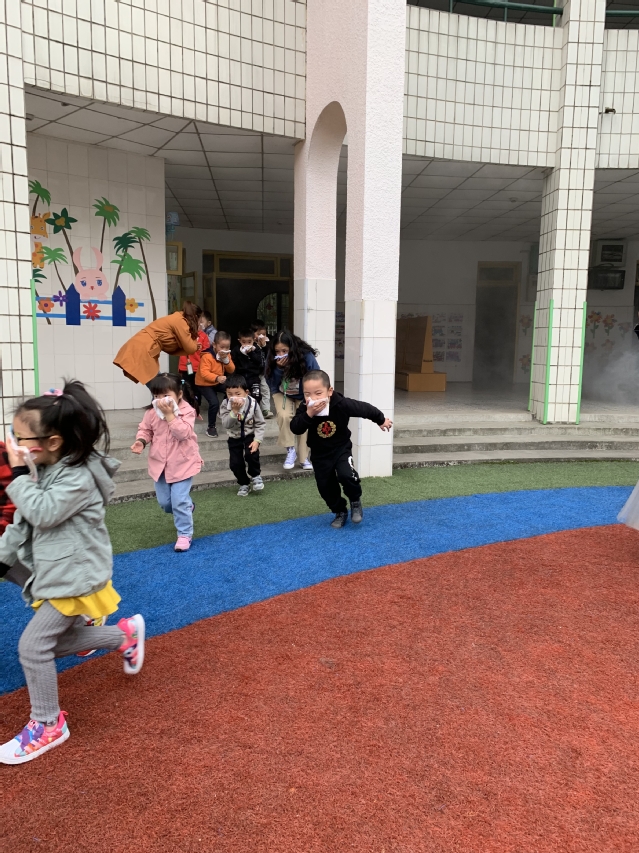 4月3日上午9点,伴随着一阵警报声骤然响起,全园进入紧急待命状态,演练总指挥一声令下,各班老师带领孩子们用打湿的毛巾捂住口鼻,弯腰、低头、扶墙有序地按指定的紧急疏散路线有序地向操场疏散撤离。