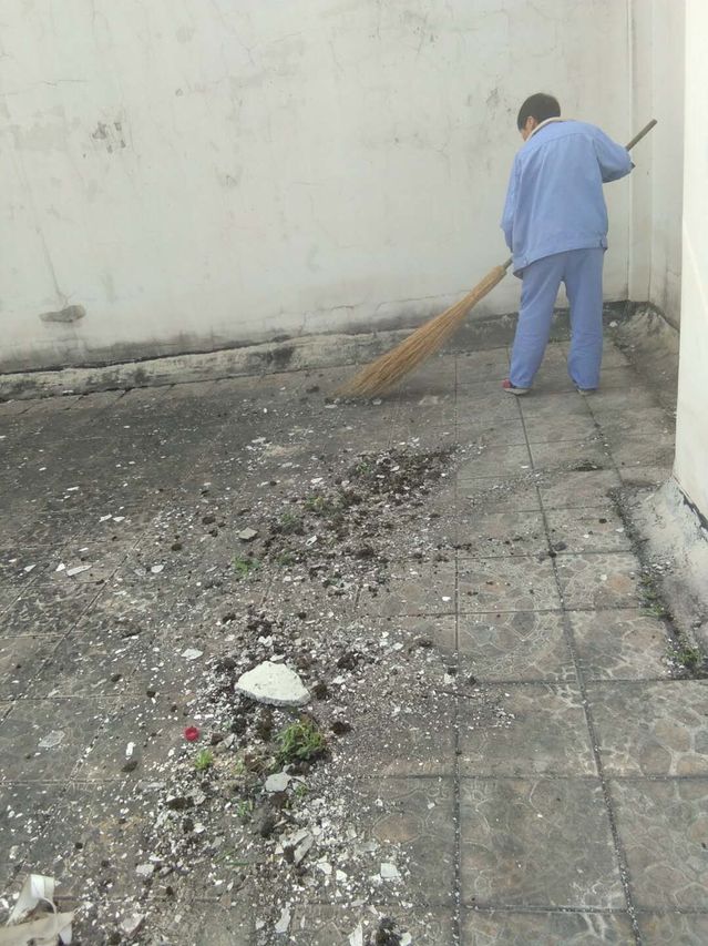 保洁正在对屋面的垃圾进行清理工作